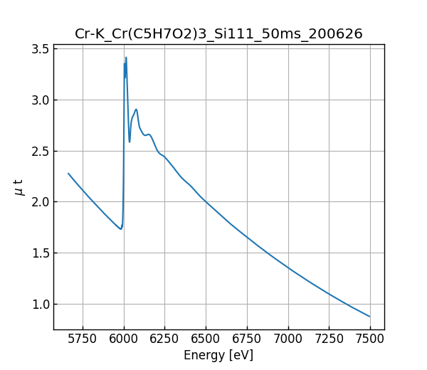 キーワード: collection - MDR XAFS DB, XAFS, SPring-8, BL14B2, Si(111), Cr(C5H7O2)3, Cr K-edge, Acetylacetonate, Chromium(III) acetylacetonate